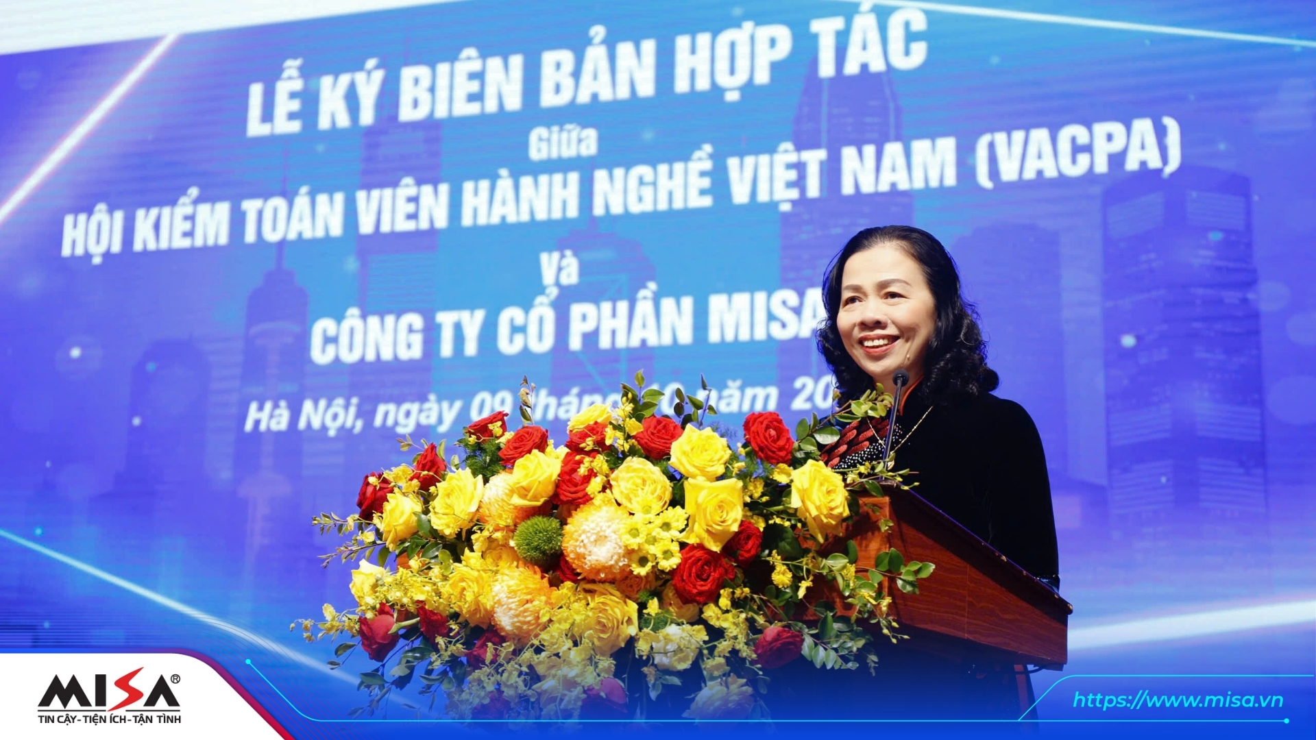 Phát biểu tại Lễ ký kết biên bản hợp tác, bà Vũ Thị Mai – Chủ tịch VACPA chia sẻ: “Sự hợp tác giữa VACPA và MISA sẽ mở ra nhiều cơ hội mới, mang lại lợi ích thiết thực cho Hội viên Hội Kiểm toán viên hành nghề Việt Nam. Song song đó, VACPA kỳ vọng sự phối hợp và phản hồi tích cực từ hội viên trong việc tư vấn, phát triển, ứng dụng và nâng cấp các giải pháp phần mềm chuyên dụng phục vụ công tác kiểm toán Báo cáo tài chính”.