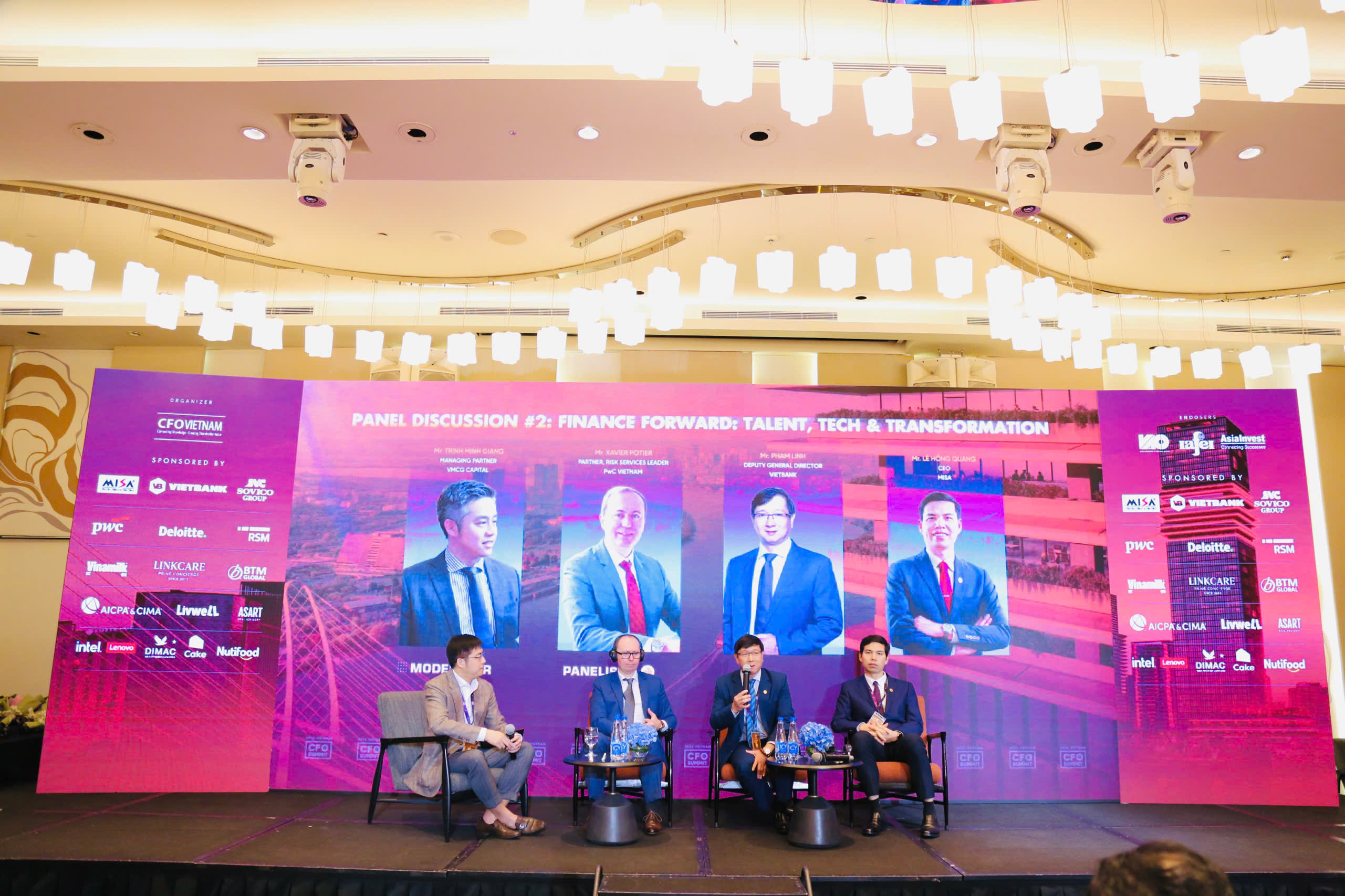 Bên cạnh phần tham luận, Tổng Giám đốc Lê Hồng Quang còn tham gia phiên tọa đàm với chủ đề “Tương lai Tài chính: Nhân tài, Công nghệ & Chuyển đổi” cùng các diễn giả: ông Xavier Potier – Phó Tổng Giám đốc Dịch vụ Tư vấn và quản lý rủi ro, PwC Vietnam; ông Mickaël Driol – Tổng Giám đốc Mekong Partners; ông Phạm Linh – Phó Tổng Giám đốc Vietbank. Phiên thảo luận do ông Trịnh Minh Giang – Giám đốc Điều hành, VMCG Capital điều phối, mang đến những góc nhìn đa chiều về chiến lược nhân sự, ứng dụng công nghệ và hành trình chuyển đổi của bộ phận tài chính trong doanh nghiệp hiện đại.
