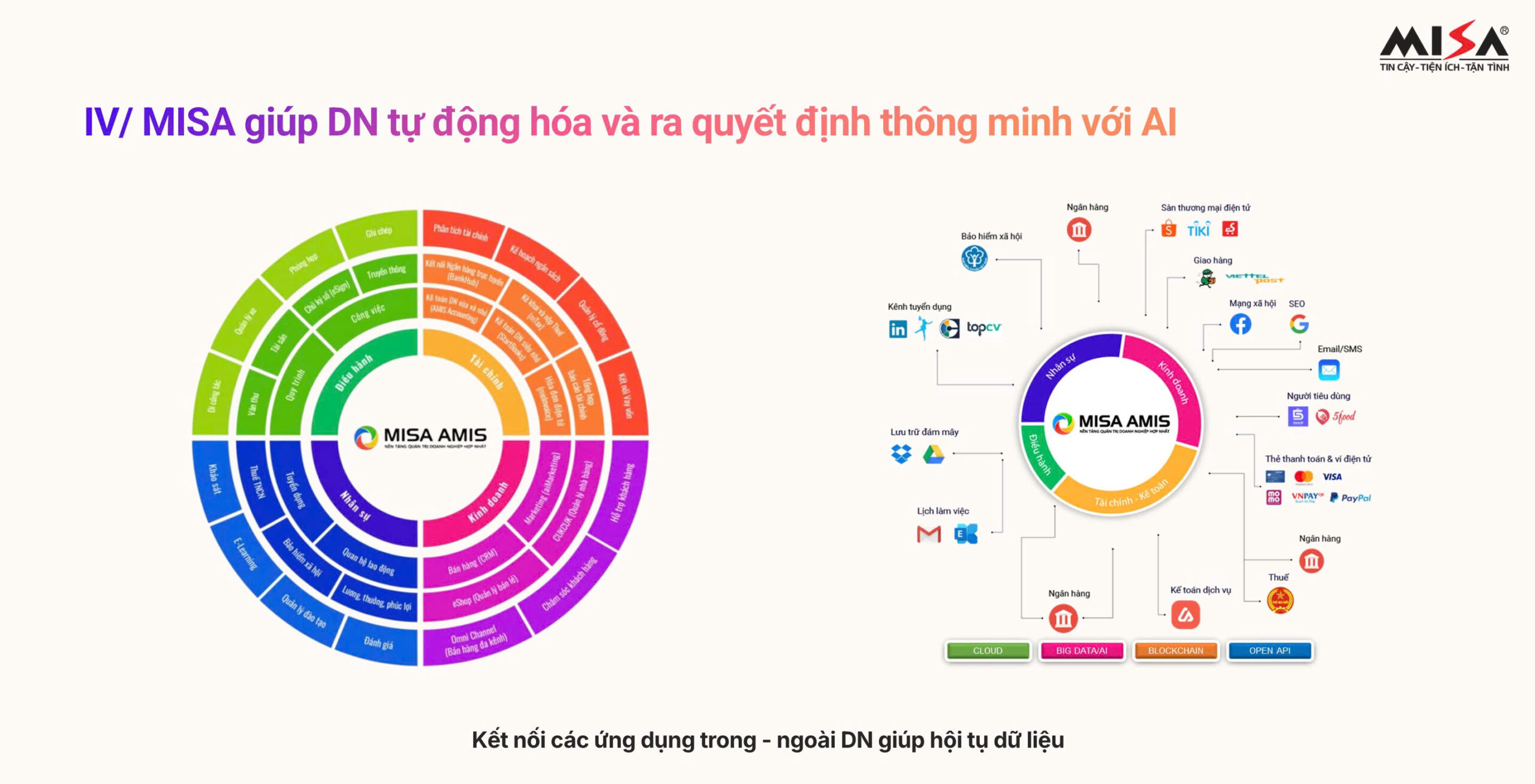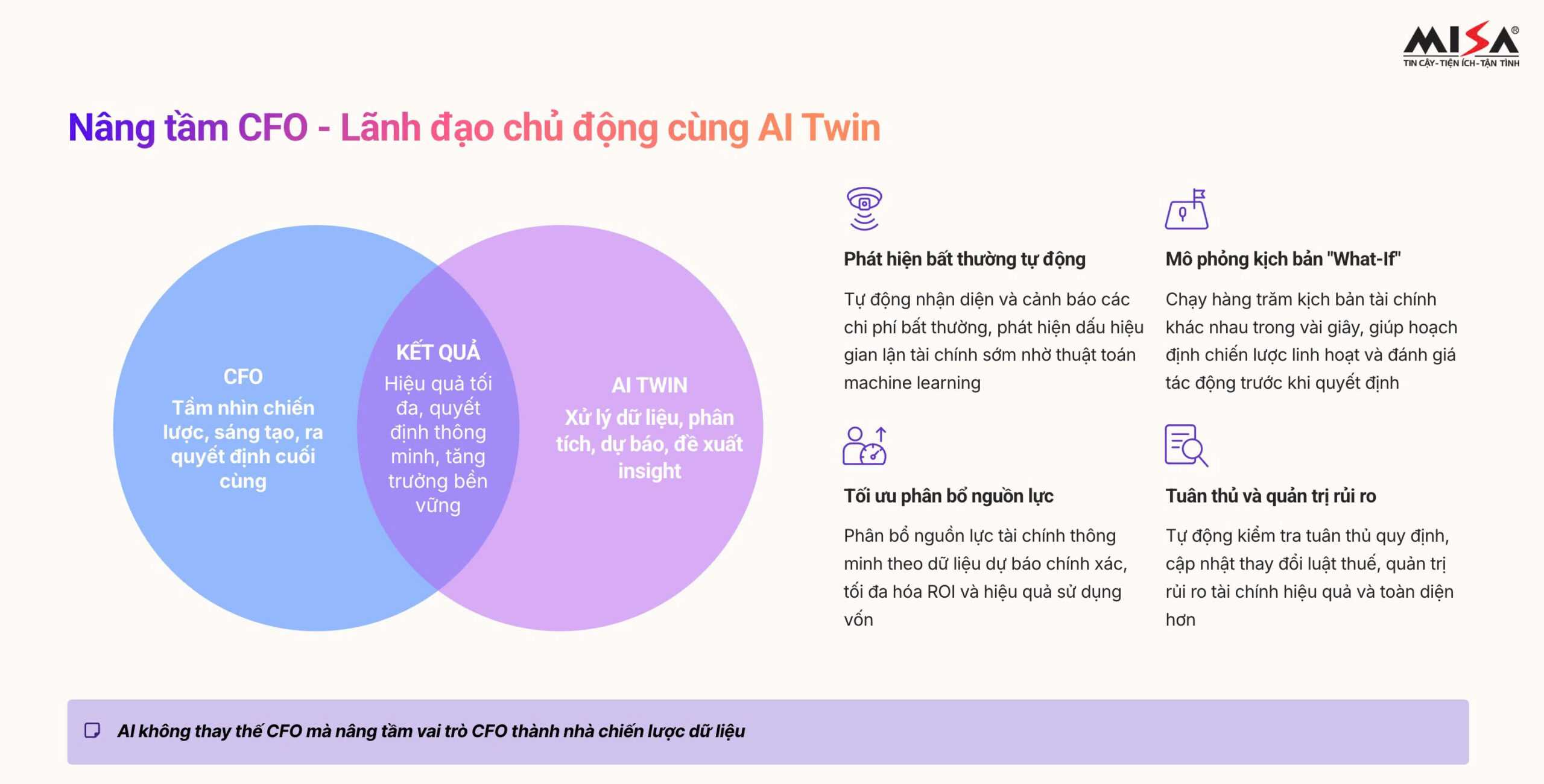 Bắt kịp xu hướng ứng dụng AI Twin vào quản trị, MISA đã phát triển nền tảng quản trị doanh nghiệp hợp nhất MISA AMIS như một hệ sinh thái dữ liệu “thân thiện với AI”, nơi dữ liệu từ các bộ phận kế toán, bán hàng, nhân sự, vận hành… được kết nối liền mạch. Trên nền tảng đó, AI Twin CFO và AI Twin Kế toán có thể hoạt động đồng bộ, từ việc xử lý nghiệp vụ chi tiết đến phân tích, dự báo và đề xuất chiến lược ở tầm lãnh đạo.