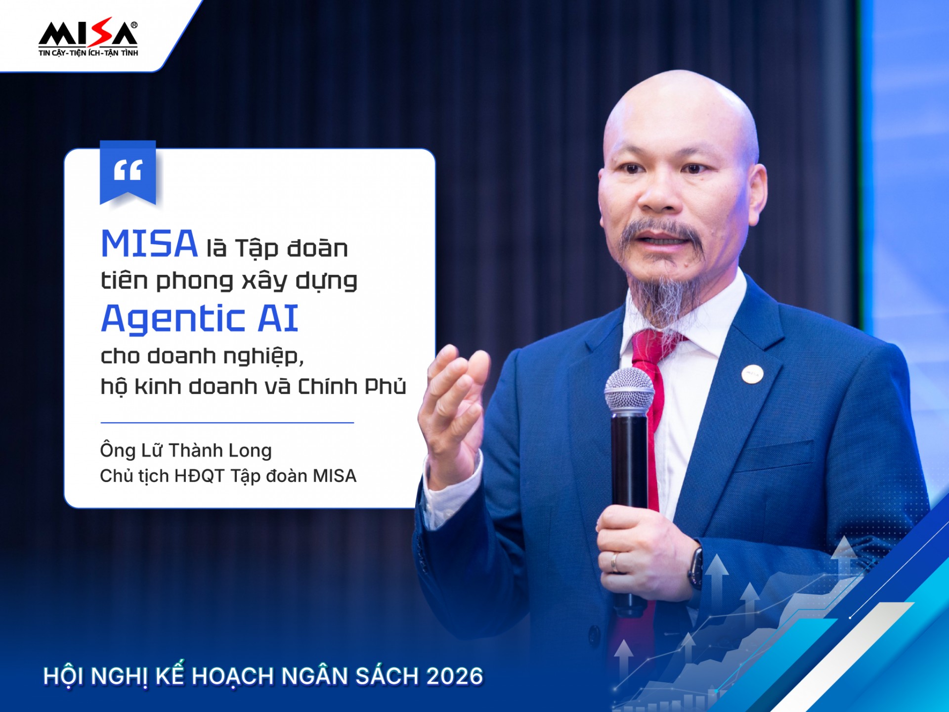 Phát biểu khai mạc hội nghị, Chủ tịch HĐQT Lữ Thành Long đã có bài phát biểu định hình toàn bộ hướng đi chiến lược của MISA trong năm 2026. Chủ tịch HĐQT MISA nhấn mạnh ba trụ cột xuyên suốt sẽ dẫn dắt MISA trong năm tới: Xây dựng sản phẩm theo hướng Agentic AI; Phát triển người dùng trong tổ chức; và Thay đổi nhận diện thương hiệu – định vị lại thương hiệu MISA. Đây không chỉ là kế hoạch vận hành cho một năm mới, mà là bước chuyển mình chiến lược đưa MISA tiên phong dẫn dắt kỷ nguyên Agentic AI tại Việt Nam.