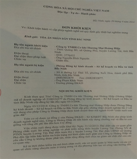 Không đồng tình với hướng giải quyết của Sở Kế hoạch và Đầu tư tỉnh Bắc Ninh, những người nuôi gián đất đã chính thức gửi đơn kiện Phòng Đăng ký kinh doanh của Sở này ra tòa án tỉnh.