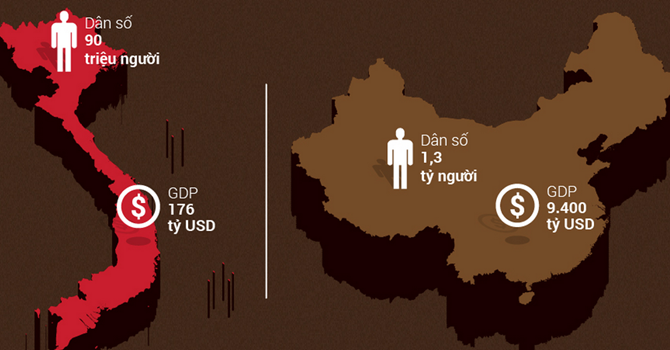 Chiến lược [INFOGRAPHIC] Tương quan kinh tế Việt Nam – Trung Quốc 15/05/2014 FacebookLinkedin Trung Quốc có lợi thế rõ rệt về quy mô kinh tế, dự trữ ngoại hối nhưng lại gặp bất ổn về năng lượng, lương thực, khiến họ phải đẩy mạnh thu mua từ Việt Nam và các nước láng giềng khác. Theo Bizlive
