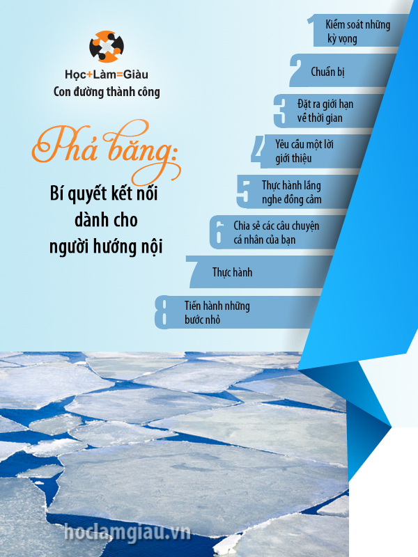 Các sự kiện kết nối có vẻ là dành cho những người có cá tính đặc biệt – “làm hết mình, chơi hết mình”. Những căn phòng chật ních người – chưa kể tới áp lực phải làm người thú vị và được yêu thích – khiến hầu hết những người hướng nội vã mồ hôi tay. Mặc dù sự nổi bật là một phần tự nhiên của việc kết nối, nhưng điều đó không có nghĩa là bạn phải trở thành trung tâm của sự chú ý. Thay vì tiếp cận việc kết nối như một người hướng ngoại, những người hướng nội nên bớt căng thẳng, lập trước kế hoạch và hãy để những phẩm chất thực sự của họ tỏa sáng.
