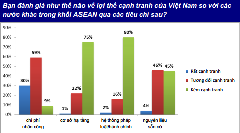 Mặt khác, phần lớn các doanh nghiệp này lại đánh giá Việt Nam đang kém cạnh tranh về mặt cơ sở hạ tầng và hệ thống pháp luật/hành chính so với các nước khác trong khối ASEAN.