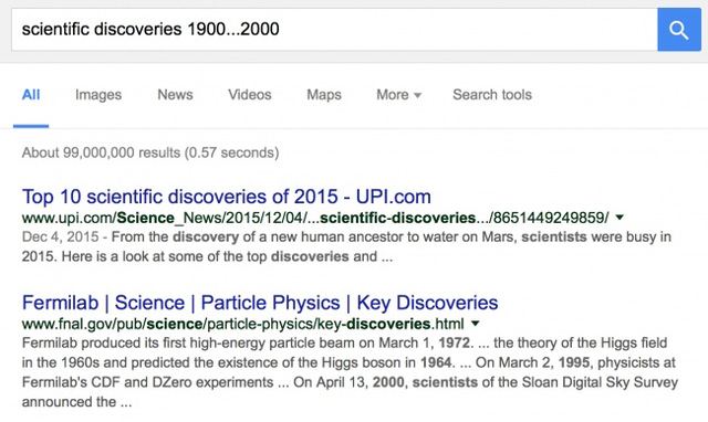 Đôi khi, chúng ta cần tìm hiểu về một sự kiện nào đó trong khoảng thời gian nhất định. Để làm như vậy, bạn có thể thêm khung thời gian vào ô tìm kiếm cùng sự giúp đỡ của ba dấu ngăn cách giữa các khung thời gian. Ví dụ, nếu chúng ta muốn tìm hiểu về những khám phá khoa học trong thế kỷ 20, chúng ta có thể viết: 1900..2000.
