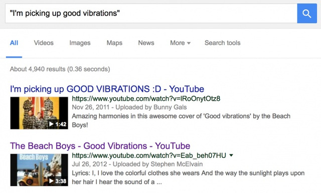Để thuật ngữ tìm kiếm trong dấu ngoặc kép là cách đơn giản và hiệu quả nhất để tìm ra kết quả cụ thể và chính xác theo thứ tự mà bạn đã nhập vào máy. Đây là cách tuyệt vời để tìm một bài hát bất kỳ khi bạn chỉ nhớ một hay 2 câu trong đó.