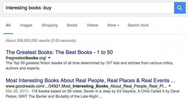 Để loại bỏ các từ tìm kiếm không quan trọng trong từ truy vấn, chỉ cần đánh biểu tượng dấu trừ trước mỗi từ bạn không muốn xuất hiện. Ví dụ, nếu bạn muốn tìm đọc những cuốn sách hay nhưng không muốn mua chúng, bạn có thể tìm như sau: Sách hay – mua.