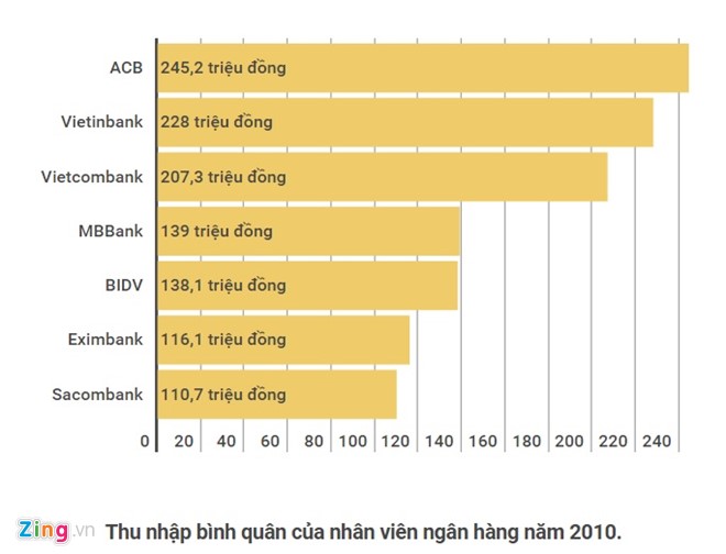 Nhìn lại năm 2010, những cái tên ngân hàng thương mại thuộc top đầu là Vietinbank, BIDV, Vietcombank, ACB hay Sacombank… thì thu nhập bình quân của nhân viên cũng cao hơn nhiều so với những ngân hàng cỡ vừa và nhỏ.