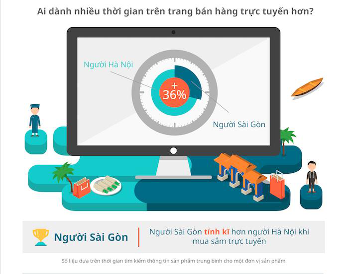 Người Sài Gòn dành nhiều thời gian để tìm kiếm thông tin về sản phẩm hơn người Hà Nội. Nghiên cứu đã cho thấy người Sài Gòn dành hơn 36% thời gian so với người Hà Nội để tìm kiếm sản phẩm.