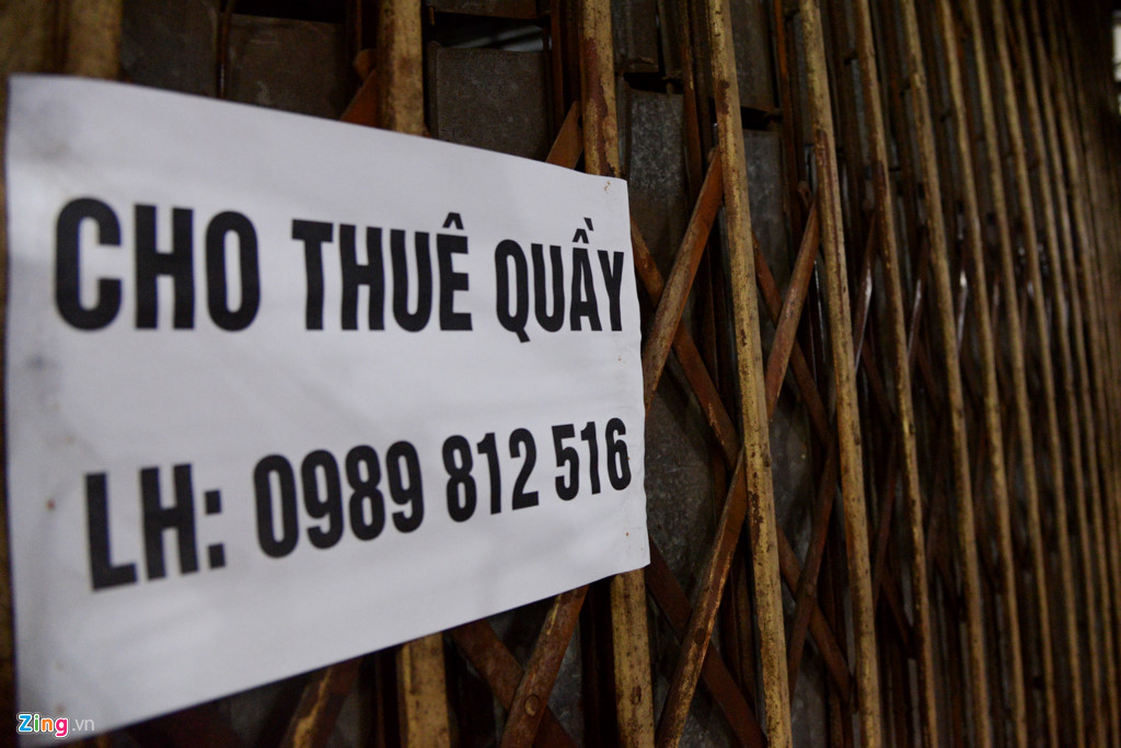 Nhiều biển cho thuê gian hàng được trưng ra nhưng sau nhiều thời gian vẫn chưa tìm được chủ mới.