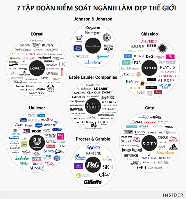 7 ông trùm mỹ phẩm thế giới bao gồm: Estée Lauder Companies, L’Oréal, Unilever, Procter và Gamble, Shiseido, Johnson & Johnson và Coty. Họ đang kiểm soát mọi sản phẩm làm đẹp mà con người sử dụng mỗi ngày trên thế giới và thu về hàng tỷ USD doanh thu mỗi năm. Họ cũng chính là người kiểm soát quảng cáo và cách mà chúng ta nghĩ về làm đẹp mỗi ngày.