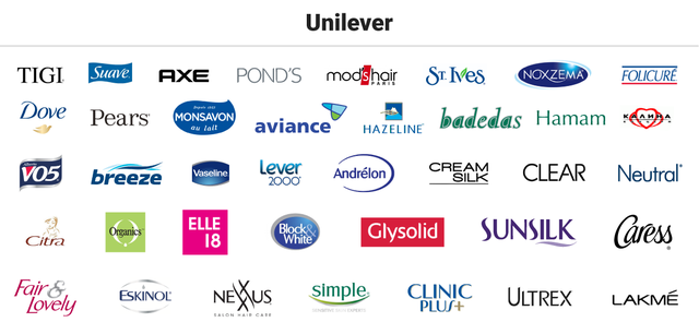 Unilever có tổng cộng 38 thương hiệu làm đẹp phụ và rất nhiều trong số đó thường xuyên được bán tại các cửa hàng thuốc của Mỹ như Nexxus, Ponds, TIGI, Dove, Vaseline và Lever 2000.