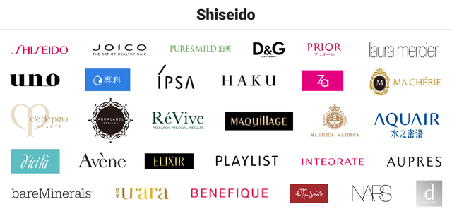 Shiseido – nhà sản xuất mỹ phẩm lớn nhất Nhật Bản – có khoảng 30 thương hiệu làm đẹp, trong đó bao gồm cả một số thương hiệu trang điểm như bareMinerals, Nars, và Laura Mercier.