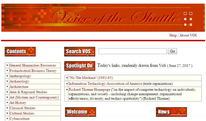 Cứu cánh cho bất kỳ ai đang vật vã với những tác phẩm văn học, từ cổ điển đến kinh điển và hiện đại. Ngoài ra, còn có các chủ đề về nhân văn học, nhân chủng học và nghiên cứu văn hóa. Được đồng bộ với các trang như Sci-Tech, CyberCulture và Technology of Writing, Voice of The Shuttle luôn cập nhật và giữ được nguồn thông tin không những phong phú mà còn tươi mới.