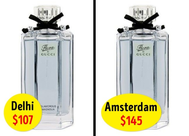 Nước hoa Flora by Gucci có giá chính thức là 119USD, nhưng ở sân bay Amsterdam là 145USD và chỉ có 107USD ở Delhi.