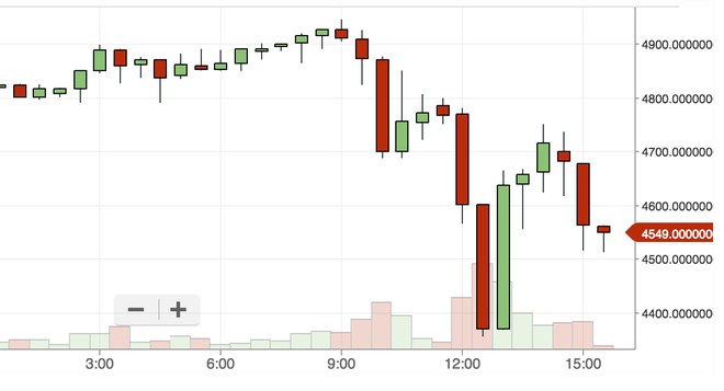Những cú “dump” trong vòng 3 tiếng kể từ khi đạt đỉnh đã đưa giá trị Bitcoin trên sàn Bittrex về tới mức 4.355 USD.