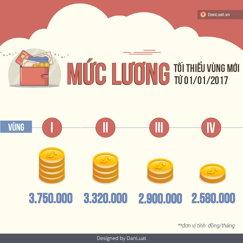 Từ ngày 01/01/2017, mức lương tối thiểu vùng áp dụng cho người lao động làm việc theo hợp đồng lao động tại các doanh nghiệp như sau: