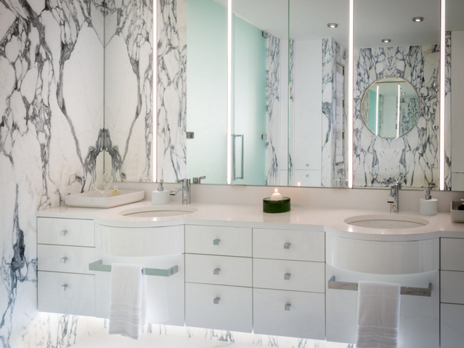 Đội thiết kế nội thất đã mất nhiều tháng tại Ý để tự tay lựa chọn đá cẩm thạch Calacatta Carrara cho các bức tường nhà tắm trong căn hộ. Tất nhiên, tường nhà tắm trong khu văn phòng của Facebook không được thiết kế theo ý tưởng này.