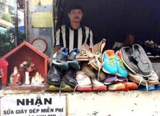 Người thanh niên căm cụi sửa chữa lại chiếc giày đã hỏng. Từng mũi kim, anh may giáp vòng chiếc đế giày. Hết một...